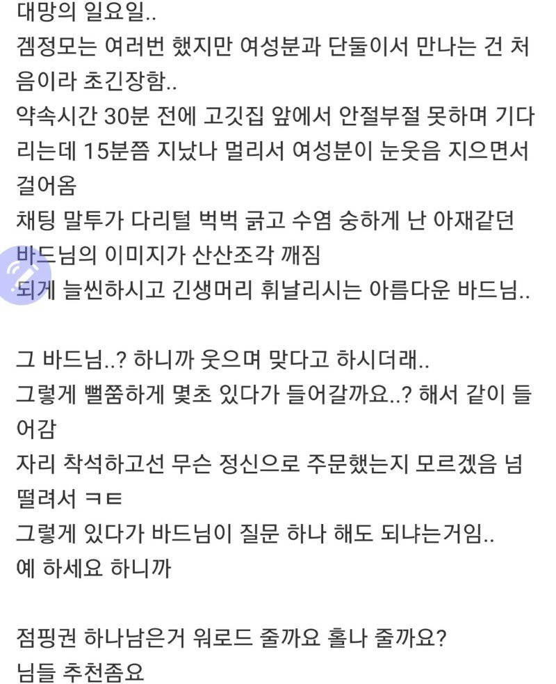 같이 로아하던 여자와 오프라인에서 만나게 된 썰 라이츄 0 1297 0 07.14 20:00 link URL 복사: https://humorpick.com/bbs/board.php?bo_table=ssul&wr_id=409 이런건 또 혼자보면 안된다고 배웠어요 나만볼 순 없지 0