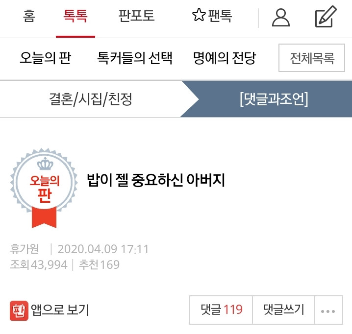 며칠 전 일입니다.어머니는 코로나 사태로 인하여 직장으로부터 2주간 휴가를 받으셨고, 매일 야근과 주말출근에 치여 지내시다가 간만에 받은 휴가로 집에서 쉬고 계셨습니다.평소와 같이 휴가 중에도 몇가지 밑반찬과 호박전, 사골 등을 해놓으셨구요.그런데 아버지가 술을 드시고 오셔서는 일주일 쉬면서 밥한끼 제대로 줘봤냐, 양심이 없다. 어머니께 큰소리를 내시더라구요.속상한 마음에 제가 고민하다 아버지께 카톡으로 아래와 같이 보냈습니다.