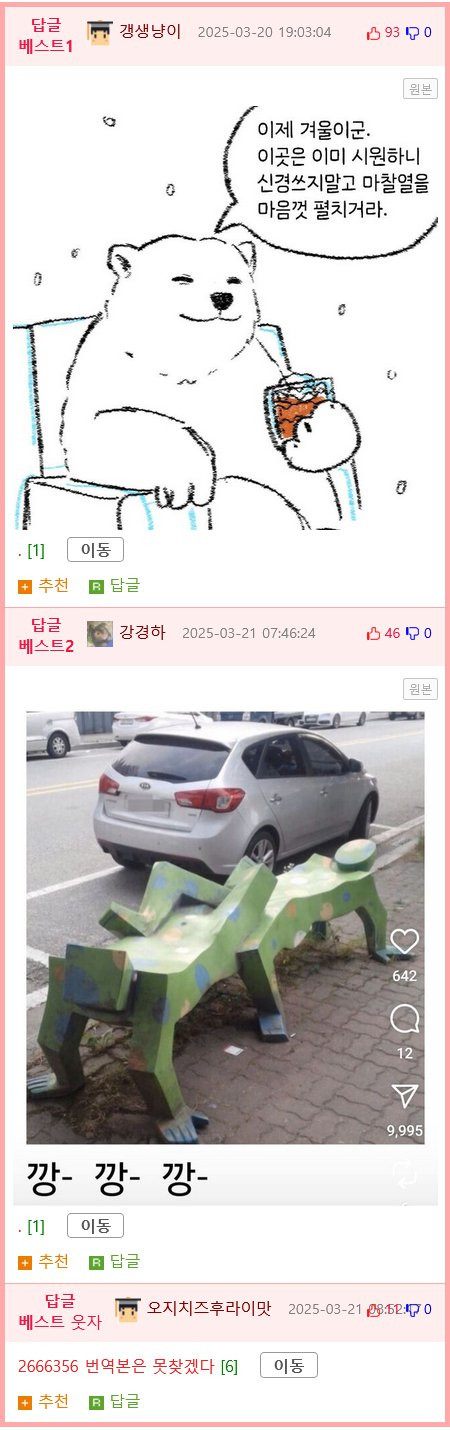 ㅇㅎ) 북극곰이 빡쳐서 에어컨 고장낸.manhwa 메이플 0 1638 0 05.22 03:00 link URL 복사: https://humorpick.com/bbs/board.php?bo_table=toon&wr_id=4526 0