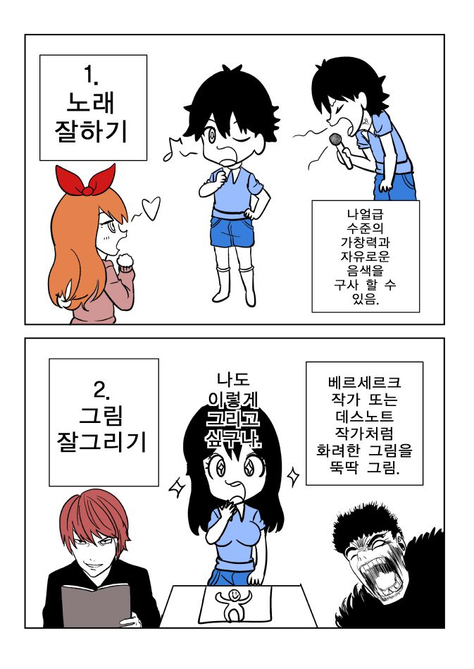노래 잘부르기 vs 그림 잘그리기 만화 우라칸 0 908 0 06.09 15:00 link URL 복사: https://humorpick.com/bbs/board.php?bo_table=toon&wr_id=4674 여러분들은 어떤걸 더 잘하고싶으신가요? ㅋㅋㅋ 0