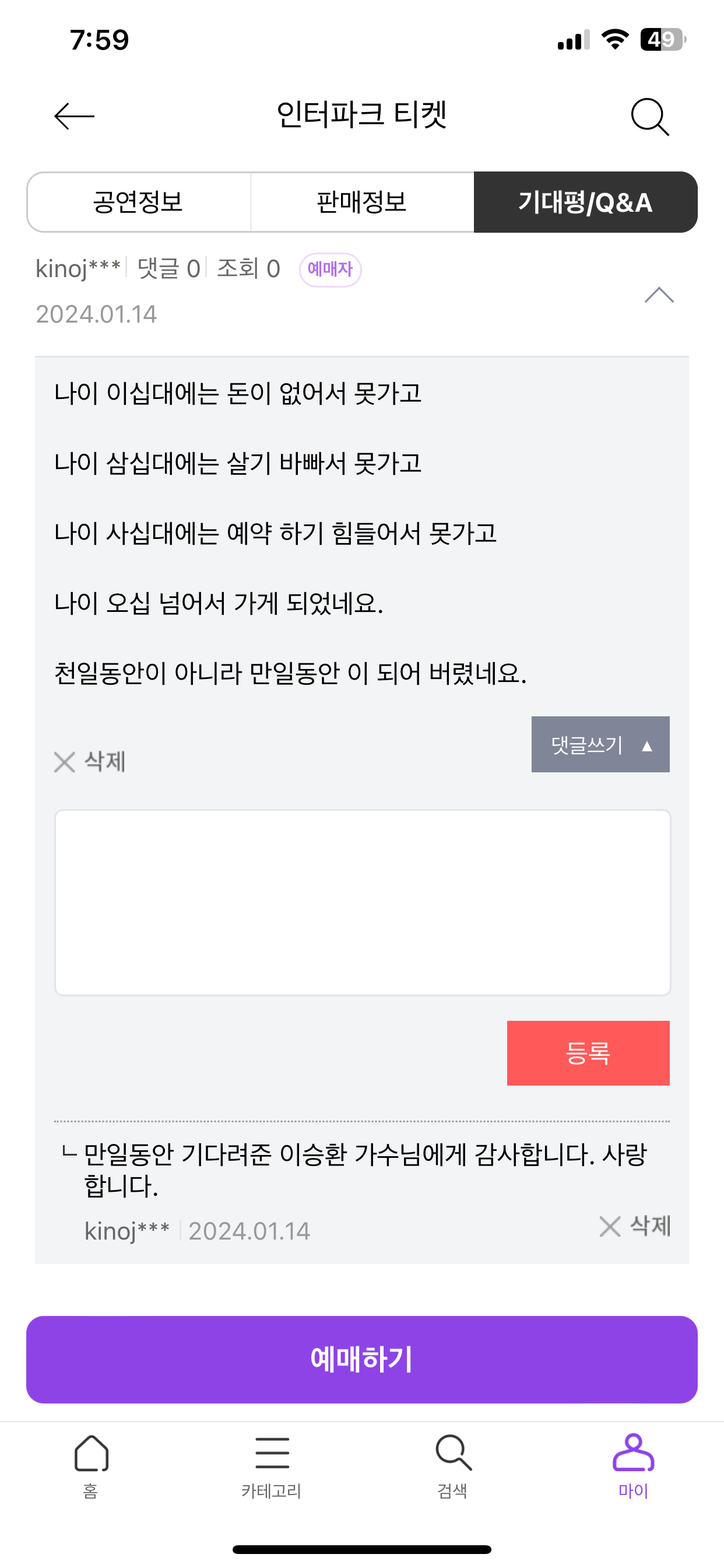 나이 오십이 되어 갈수 있게 되었네요. 익명 0 1340 1 2024.01.14 20:03 link URL 복사: https://www.humorpick.com/bbs/board.php?bo_table=free&wr_id=1712 콘서트 기대평도 쓰고 참 기분 좋네요. 1