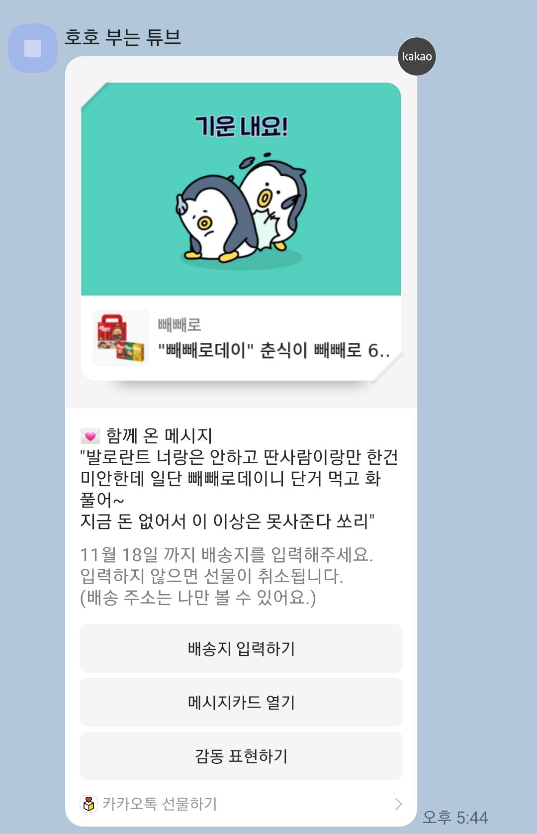 그래서 그거 보고 걍 꺼지라고 하고 씹었더니 다음날에 갑자기 톡으로 빼빼로 깊카를 보면서 사과를 함 그런데 문제는 사과하는 내용임