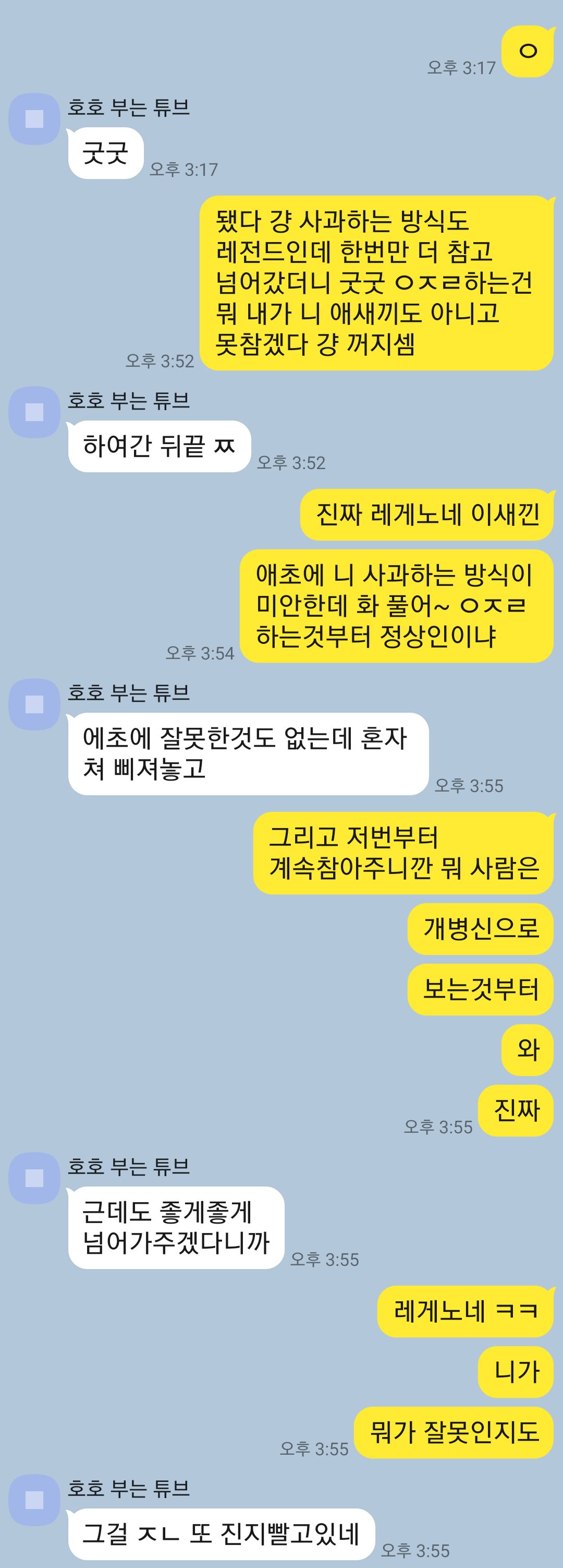 근데 자긴 잘못한게 없다 좋게 좋게 넘어가줄려 했더니 이말듣고 그냥 여기서 차단하고 손절 치면 너무 후회될것같아서 애가 뭘 잘못했는지 하나하나 비유해주면서 사과하나 받을라고 설명을 막함