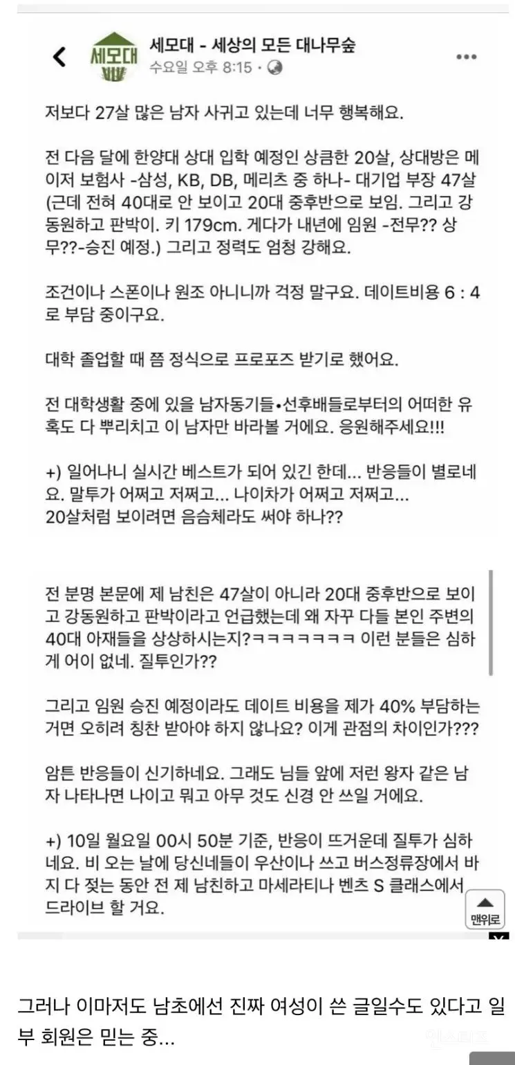 너무 티나는 주작이라 헛웃음만 나오는 27살 차이 커플 글