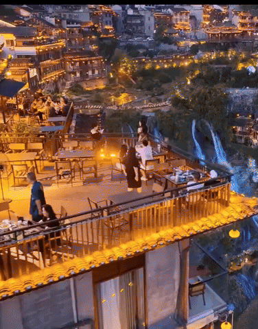 중국 후난성 푸룽 폭포마을의 야경