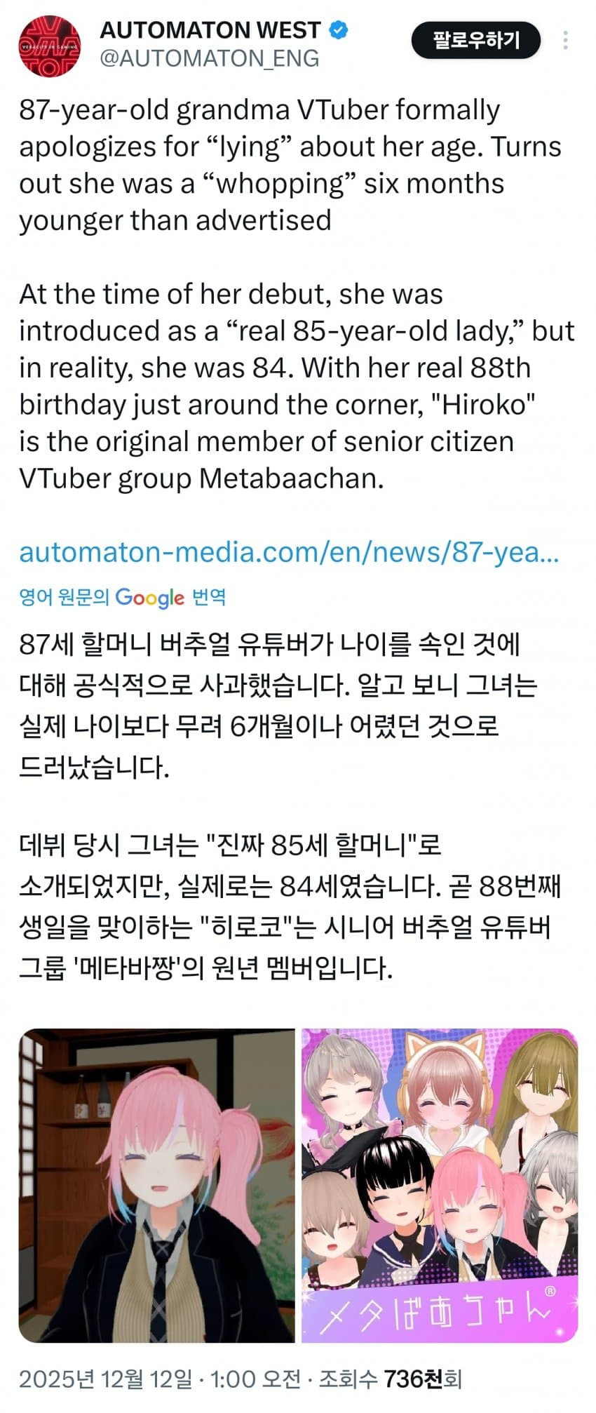 나이를 속이고 활동한 버튜버 라이츄 0 115 0 8시간전 link URL 복사: https://www.humorpick.com/bbs/board.php?bo_table=humor&wr_id=397593 나이를 속이고 활동한 버튜버 88세의 할머니 6개월 나이 늘렸다가 논란 0