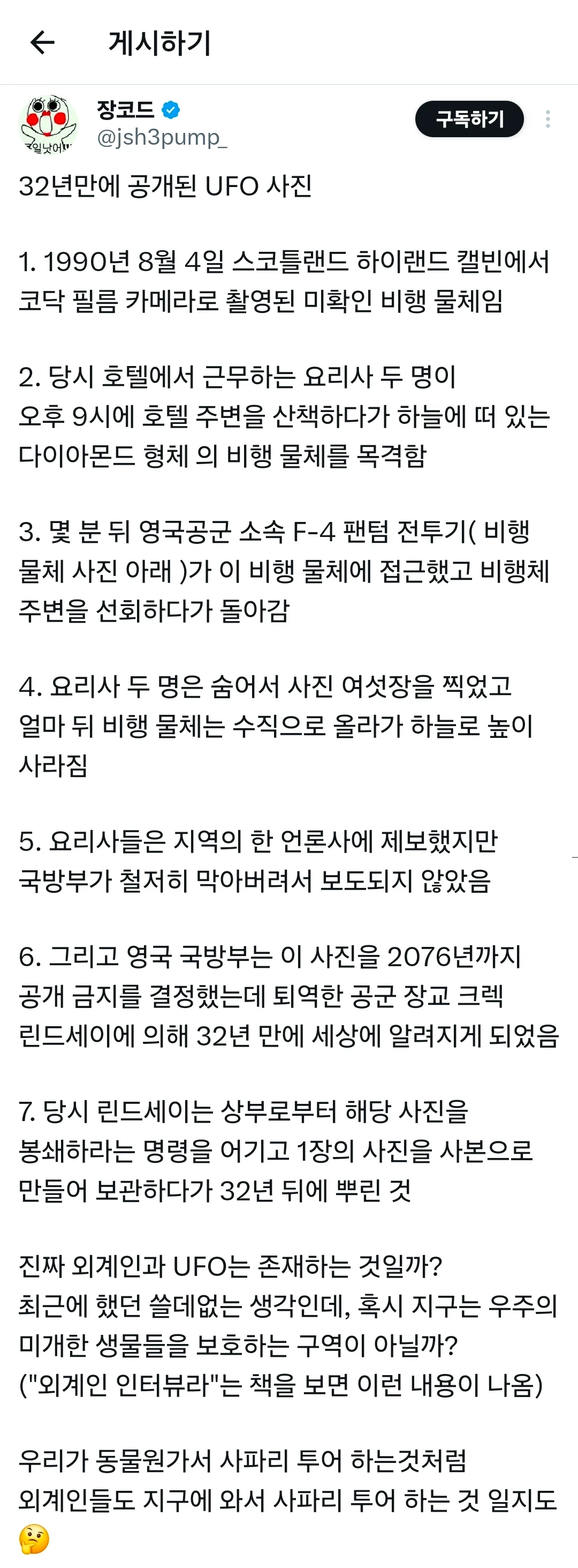 2022년 영국에서 32년만에 공개된 UFO사진 푸른바다 0 213 0 2시간전 link URL 복사: https://www.humorpick.com/bbs/board.php?bo_table=humor&wr_id=398057 0