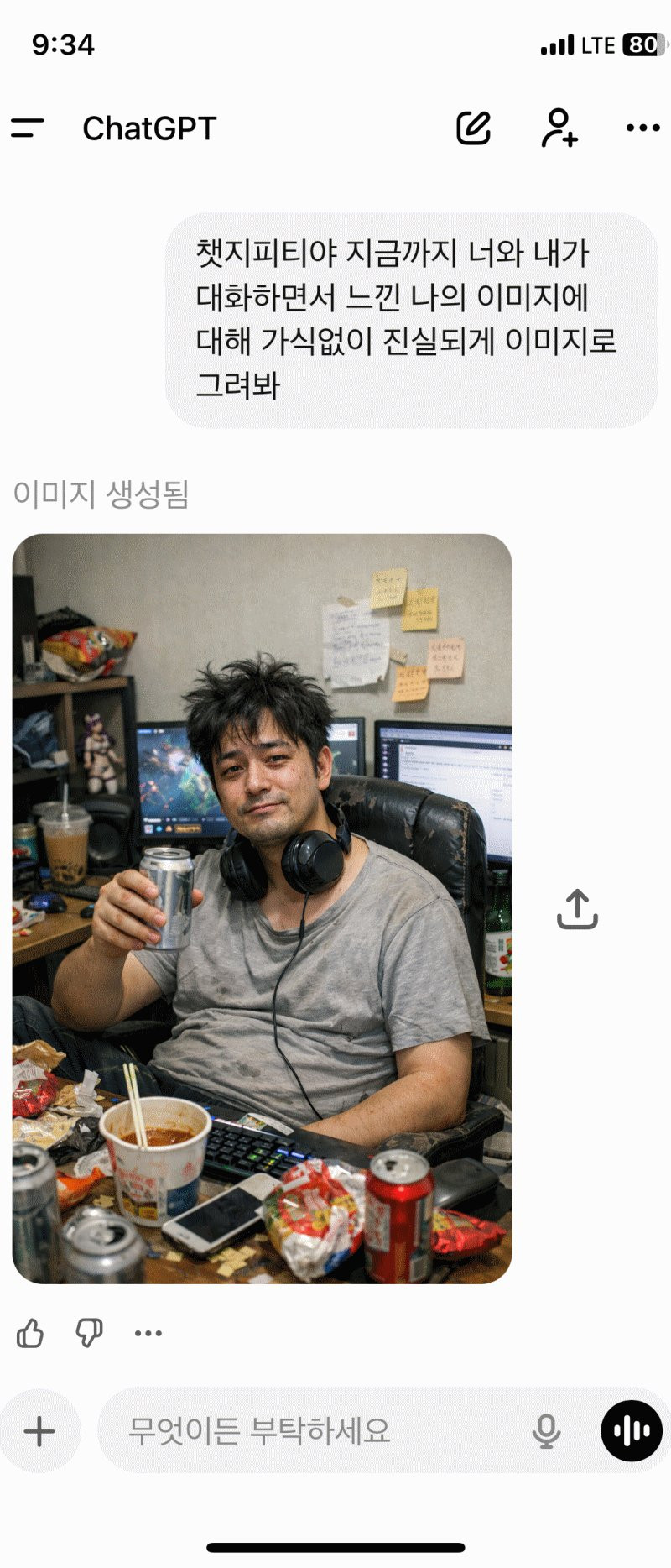 펌) 나 챗지피티 오늘부로 지운다 소밀면 0 268 0 2시간전 link URL 복사: https://www.humorpick.com/bbs/board.php?bo_table=humor&wr_id=398250 이게 사람을 멕여 이 자식 대체 어디사냐 저는 그냥 그렇네요 "지금까지 너와 내가 했던 대화를 기반으로 내가 어떤 이미지인지 가감없이 진실되게 이미지로 그려봐" 근데 얼굴은 표준형인가 본문하고 비슷하네 0