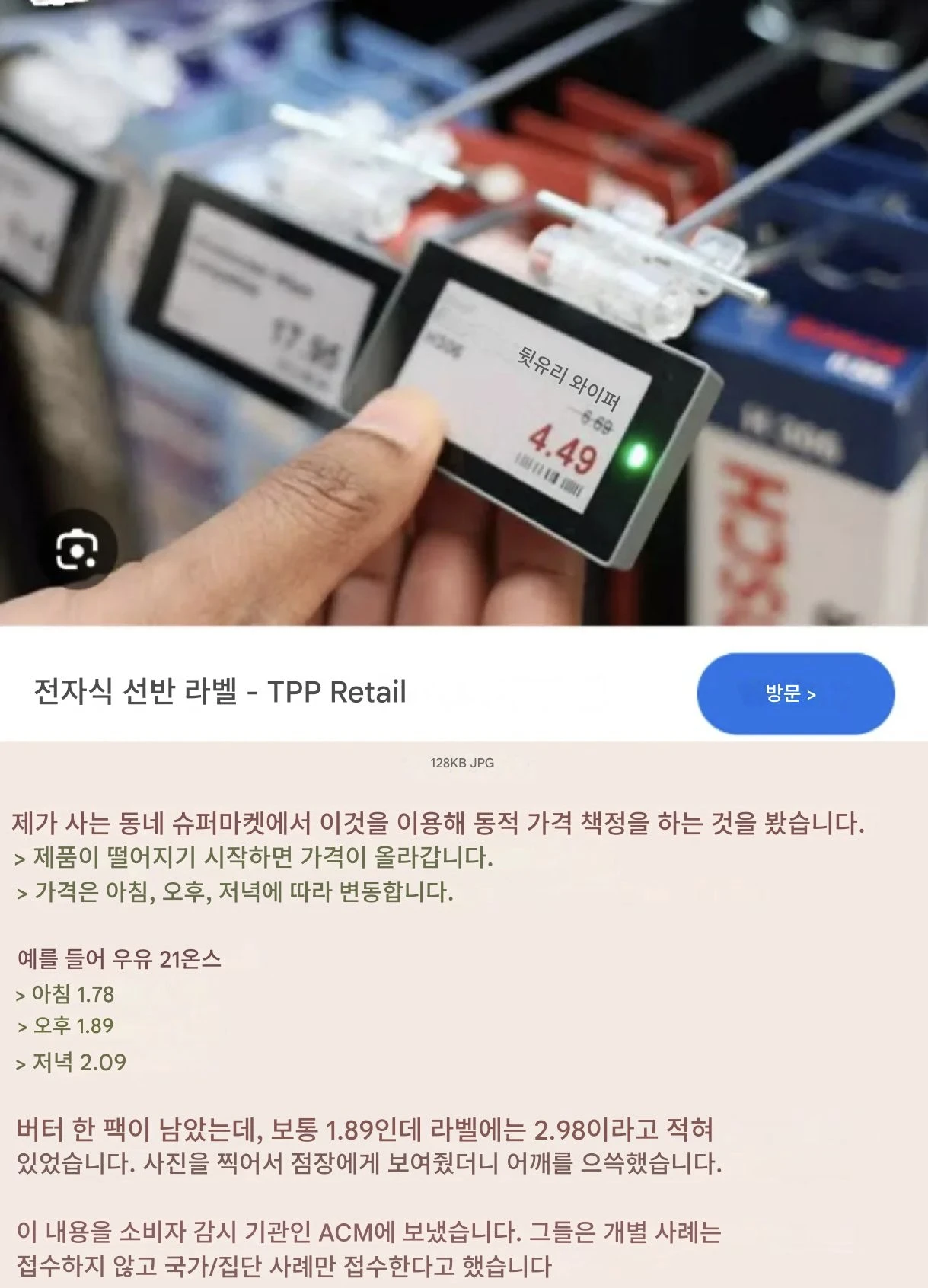 동적 가격 책정을 한다는 미국의 슈퍼마켓 소밀면 0 75 0 2시간전 link URL 복사: https://www.humorpick.com/bbs/board.php?bo_table=humor&wr_id=398445 전자 라벨로 재고 떨어지면 가격 올리고 한다고 함ㄷㄷ 0
