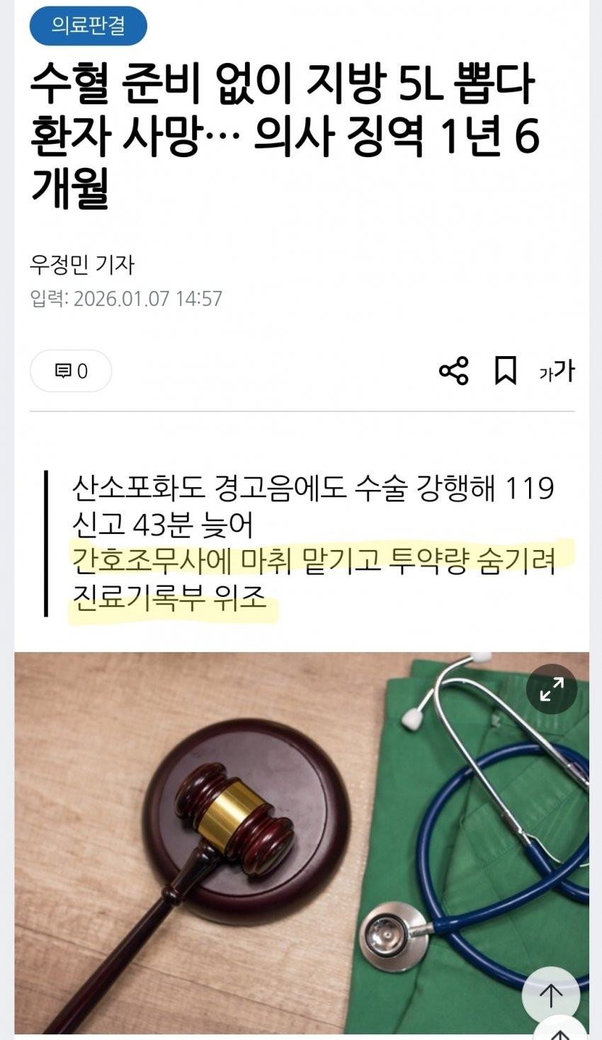수혈 준비 없이 지방 5L뽑다 환자 사망, 의사는 징역행 버디버디 0 89 0 01.11 23:00 link URL 복사: https://www.humorpick.com/bbs/board.php?bo_table=humor&wr_id=399506 0