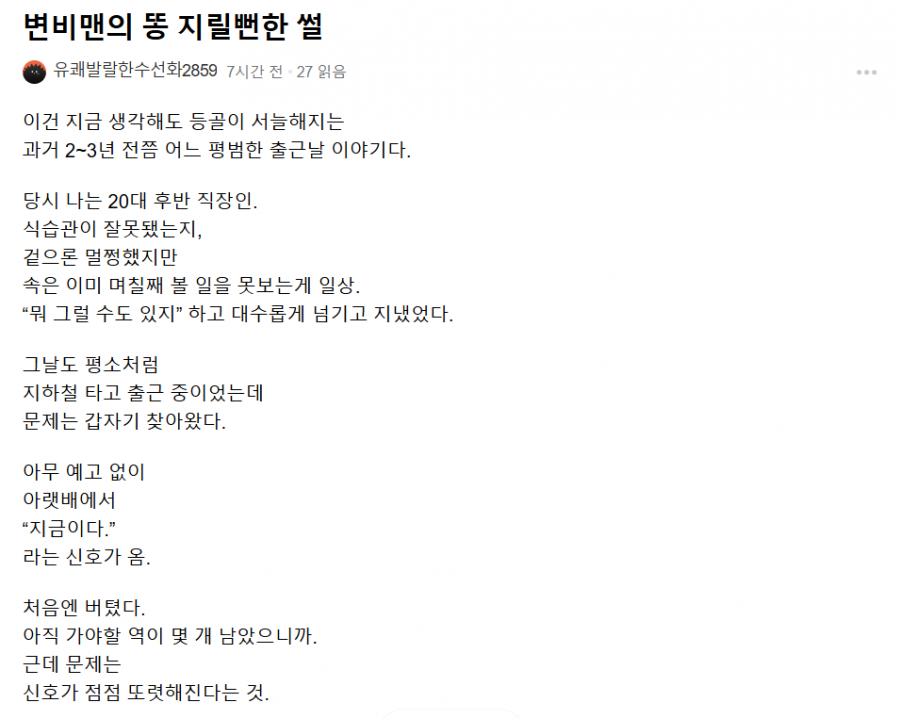 변비맨의 똥 지릴뻔한 썰 버디버디 0 281 0 6시간전 link URL 복사: https://www.humorpick.com/bbs/board.php?bo_table=humor&wr_id=401230 0
