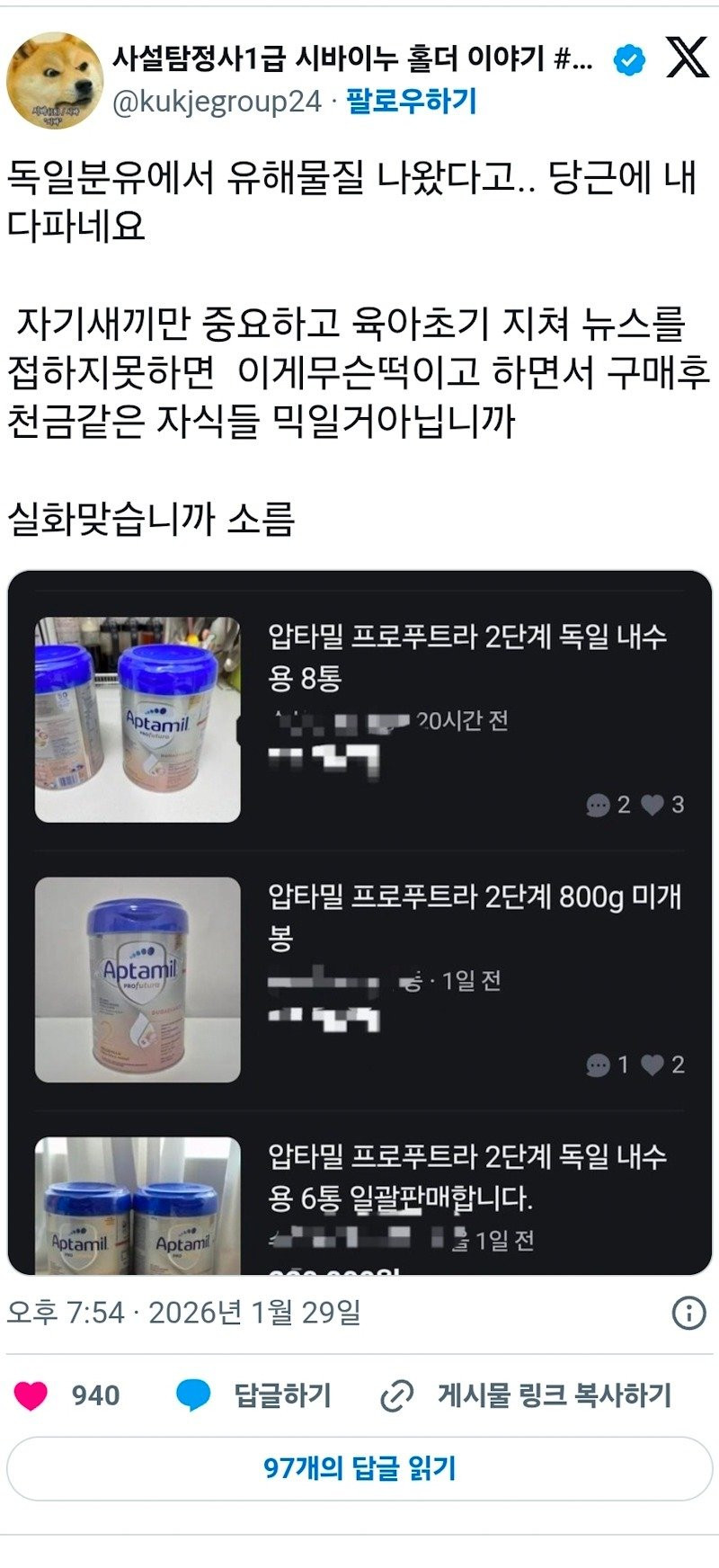 독일분유에서 유해물질 나왔다고.. 당근에 내다파네요 라카라카 0 293 0 2시간전 link URL 복사: https://www.humorpick.com/bbs/board.php?bo_table=humor&wr_id=401423 저 분유가 비싼건데, 이번에 분유에서 유해물질 걸렸음... 딸림트윗을 보니 위의 제품이 그 유해제품은 아니라는 말도 있긴 합니다 0