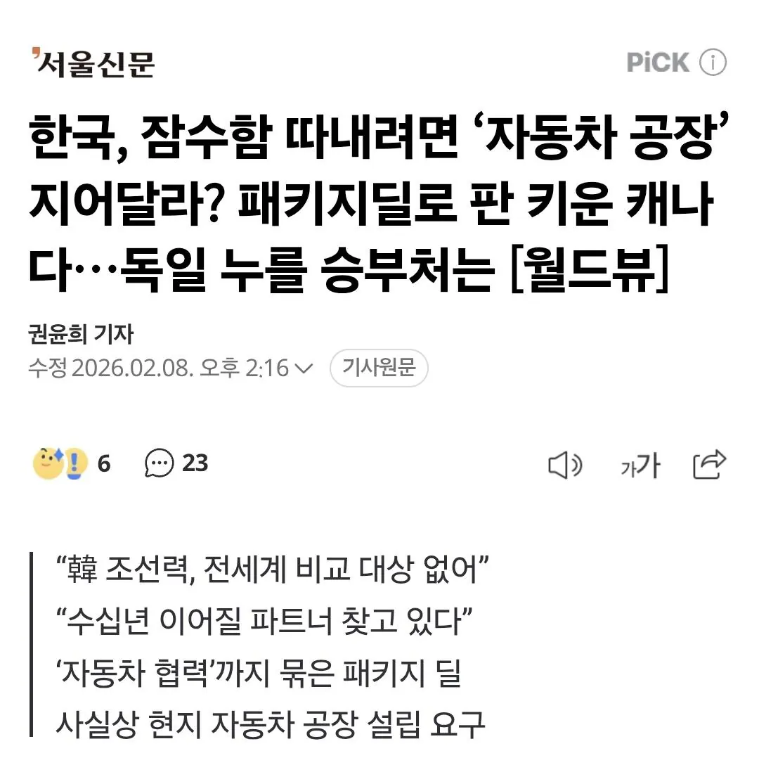 캐나다 ' 잠수함 팔려면 캐나다에 자동차 공장 지어라 ' 몽둥이 0 248 0 2시간전 link URL 복사: https://www.humorpick.com/bbs/board.php?bo_table=humor&wr_id=402189 한국, 잠수함 따내려면 ‘자동차 공장’ 지어달라? 패키지딜로 판 키운 캐나다…독일 누를 승부처는 [월드뷰] | 서울신문 잠수함 판매 위해선 자동차 공장도 캐나다에 지어라 그리고 러시아 상대로 군사지원도 해라함 0