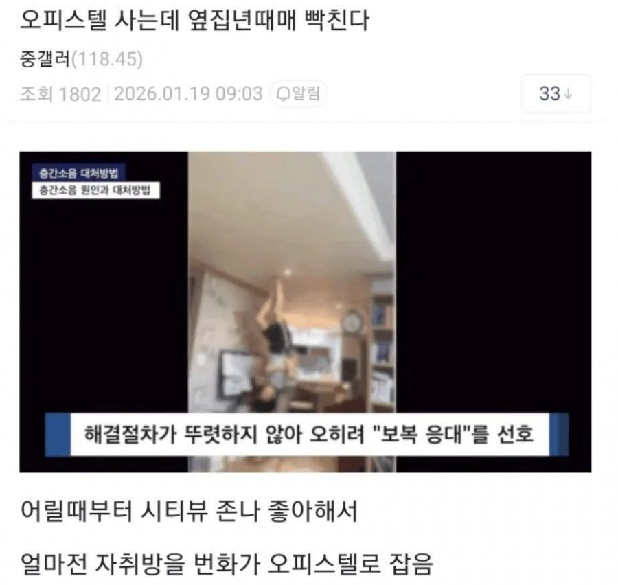 옆집 업소녀 때문에 스트레스 받는다는 오피스텔 거주자 아기물티슈 0 328 0 2시간전 link URL 복사: https://www.humorpick.com/bbs/board.php?bo_table=humor&wr_id=402583 0