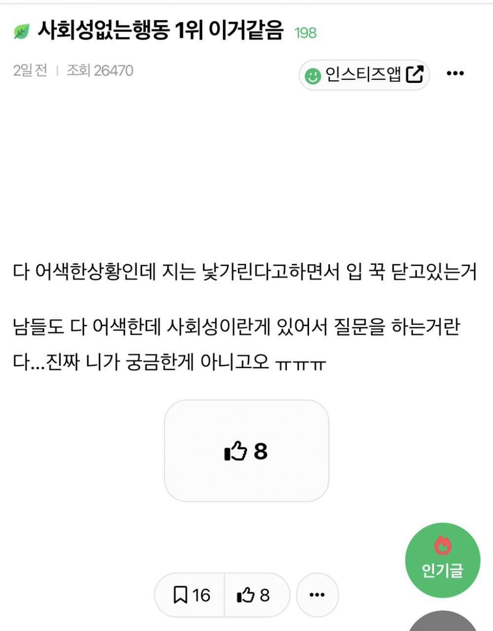 커뮤 불타고있는 사회성 없는 행동 1위 아기물티슈 0 217 0 3시간전 link URL 복사: https://www.humorpick.com/bbs/board.php?bo_table=humor&wr_id=402927 0