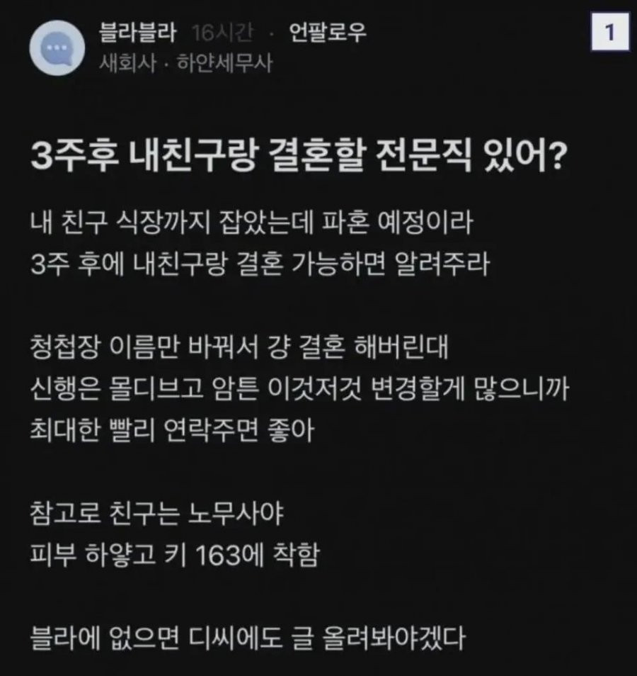 3주 후 내 친구랑 결혼할 전문직 있어? 버디버디 0 316 0 1시간전 link URL 복사: https://www.humorpick.com/bbs/board.php?bo_table=humor&wr_id=403711 아무리 그래도 급..으로??더 중요한건 남편을 구하는건지 ? 신부를 구하는건지.. 0