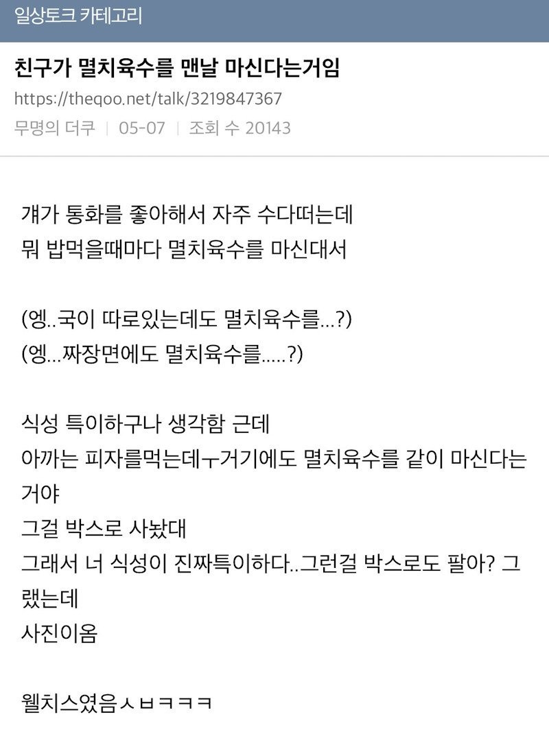 친구가 멸치육수를 맨날 마신다는거임 수민이에여 0 181 0 3시간전 link URL 복사: https://www.humorpick.com/bbs/board.php?bo_table=humor&wr_id=405276 0