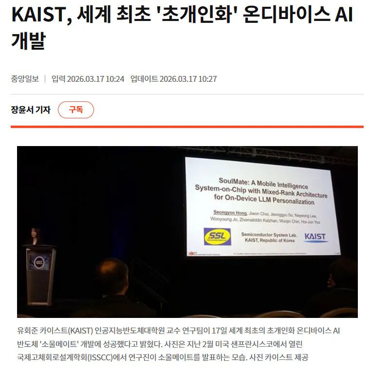 카이스트 미친 기술 개발 김밤비 0 74 0 2시간전 link URL 복사: https://www.humorpick.com/bbs/board.php?bo_table=humor&wr_id=405515 삼성, 인텔, 애플, TSMC 같은 외계인급 엔지니어들사이에서 하이라이트 논문상 받음 내용보면 휴대폰 AP칩에 넣을 NPU칩 개발했는데 추론 학습까지 가능함 ㄷ 2027 양산예정이라는데 이제 휴대폰에 자체 LLM박아놓고파라미터 조정 하는 날이 곧 올듯 대학이 실리콘 빅테크급 퍼포먼스 보여줌 ㄷㄷㄷ 0