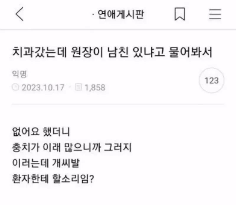 치과 갔는데 원장이 남친 있냐고 물어봐서 버디버디 0 370 0 03.21 23:51 link URL 복사: https://www.humorpick.com/bbs/board.php?bo_table=humor&wr_id=405690 0