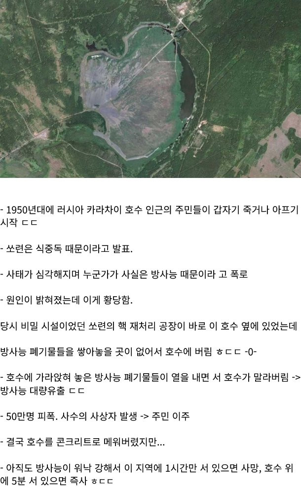 현재는 호수 전체가 콘크리트로 메워져 방사능은 많이(?) 줄어든 상태라는데