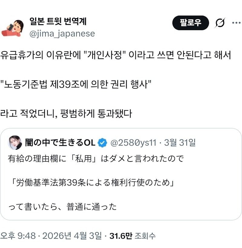 연차 사유에 '개인사정'을 쓰지말라고 할 때 꿀팁 픽시베이 0 278 0 04.05 21:34 link URL 복사: https://www.humorpick.com/bbs/board.php?bo_table=humor&wr_id=406997 근데 저건 일본이라서 한국은 저걸로 쓰면 안되구 한국은 근로기준법 제 60조에용 0