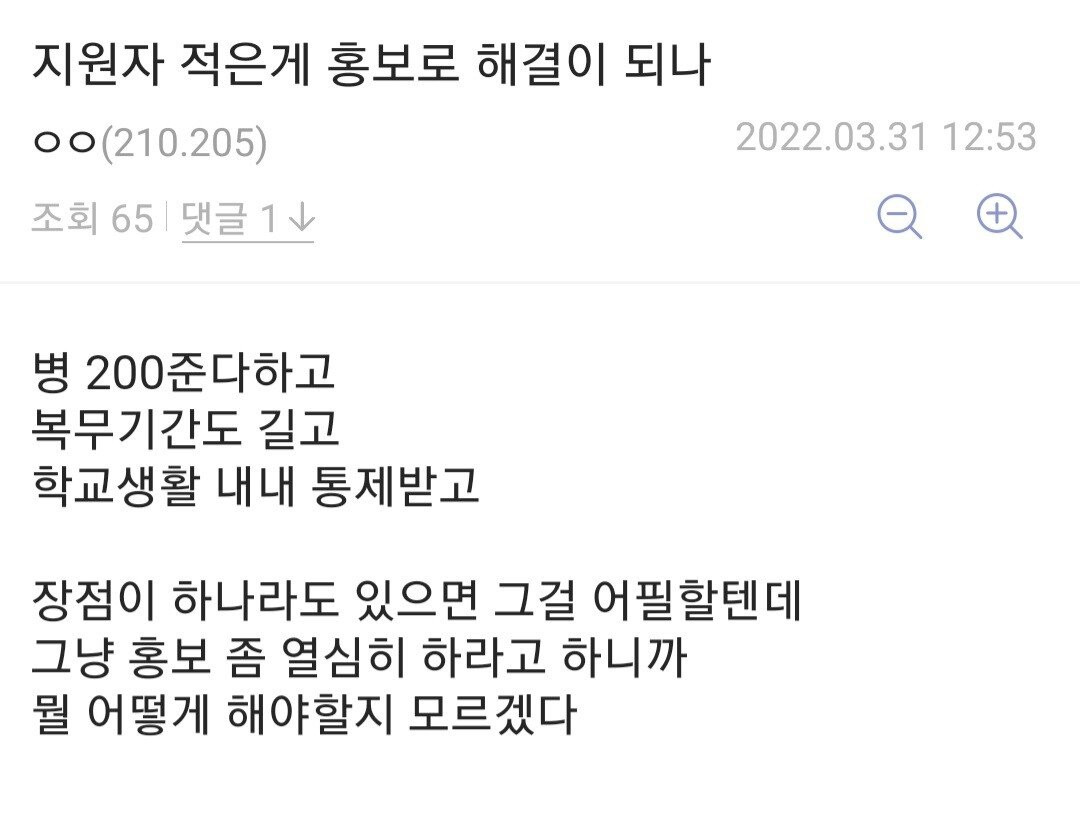 별 혜택이라 할 수도 없는걸 혜택이랍시고 여전히 모집하고 조금의 처우개선도 안해주니 미달이 안날 수가 없을 듯