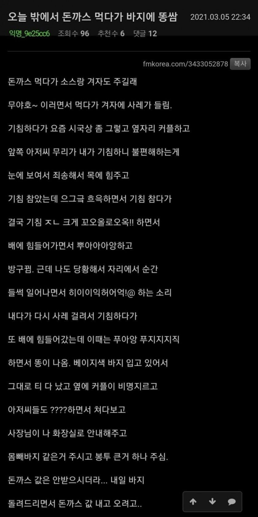 돈까스 먹다 바지에 똥 싼 썰 아기물티슈 0 265 0 2시간전 link URL 복사: https://www.humorpick.com/bbs/board.php?bo_table=ssul&wr_id=1716 ㅋㅋㅋㅋㅋㅋㅋㅋㅋㅋㅋ 0